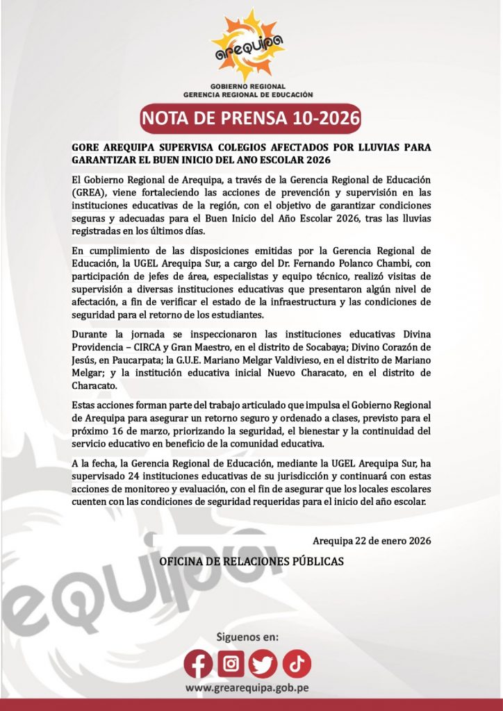 NOTA DE PRENSA 10-2026 GORE SUPERVISA COLEGIOS AFECTADOS POR LLUVIAS