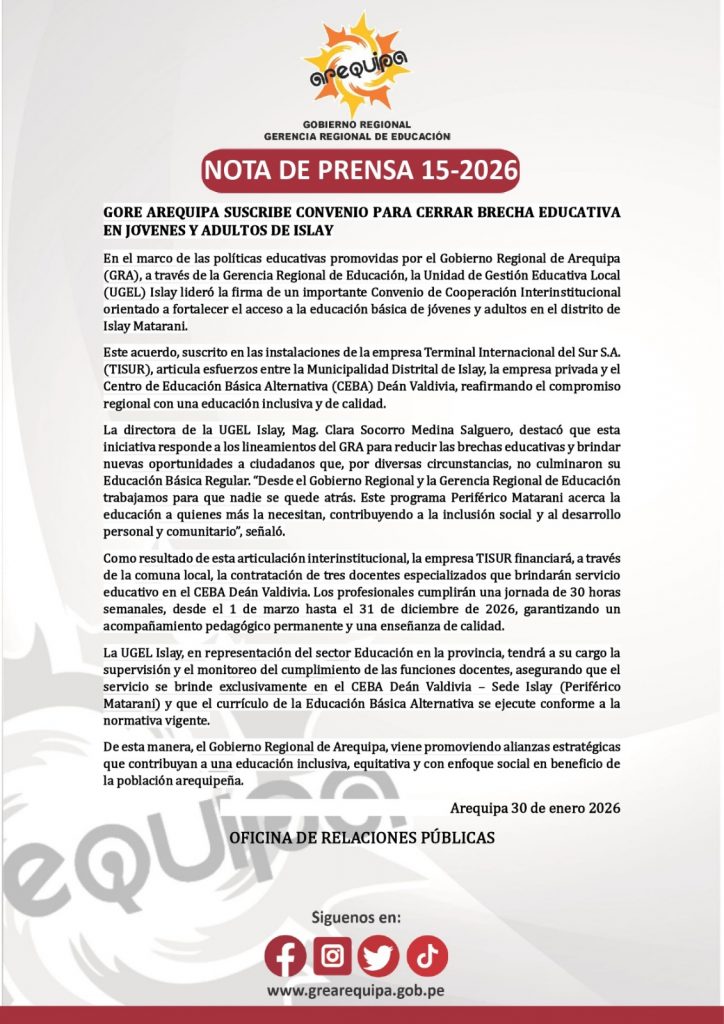 NOTA DE PRENSA 15-2026 BRECHA EDUCATIVA EN JÓVENES Y ADULTOS DE ISLAY