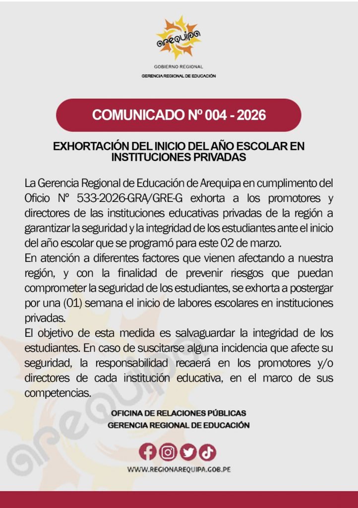 COMUNICADO 004-2026 EXHORTACIÓN DEL INICIO DEL AÑO ESCOLAR EN INSTITUCIONES PRIVADAS